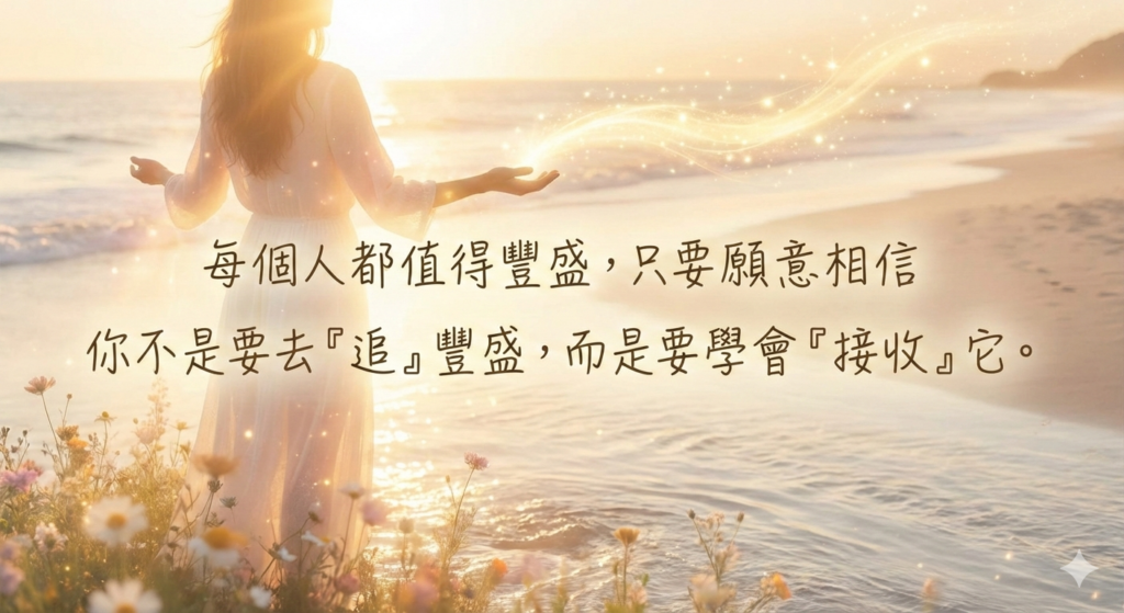 請記得,你本來就值得富足,也值得被愛與支持。你不是要去「追」豐盛,而是要學會「接收」它。只要你願意相信,豐盛,就會慢慢靠近你。