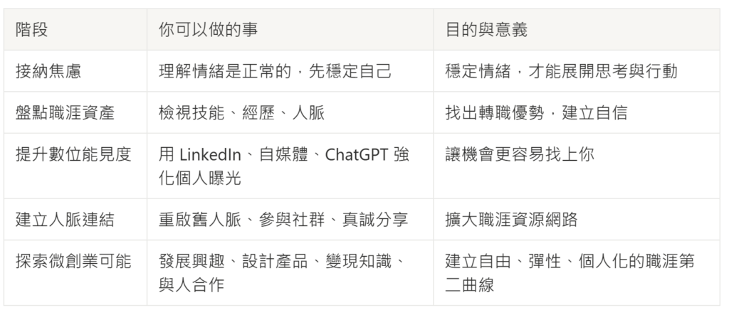 職涯的每一次轉彎,都是與世界重新對話的機會。你不是被時代淘汰,而是準備好用新的方式參與這個時代。只要你願意相信自己,願意重新盤點、重新學習、重新出發,焦慮就會轉化為行動,行動也將帶你走向新的可能。